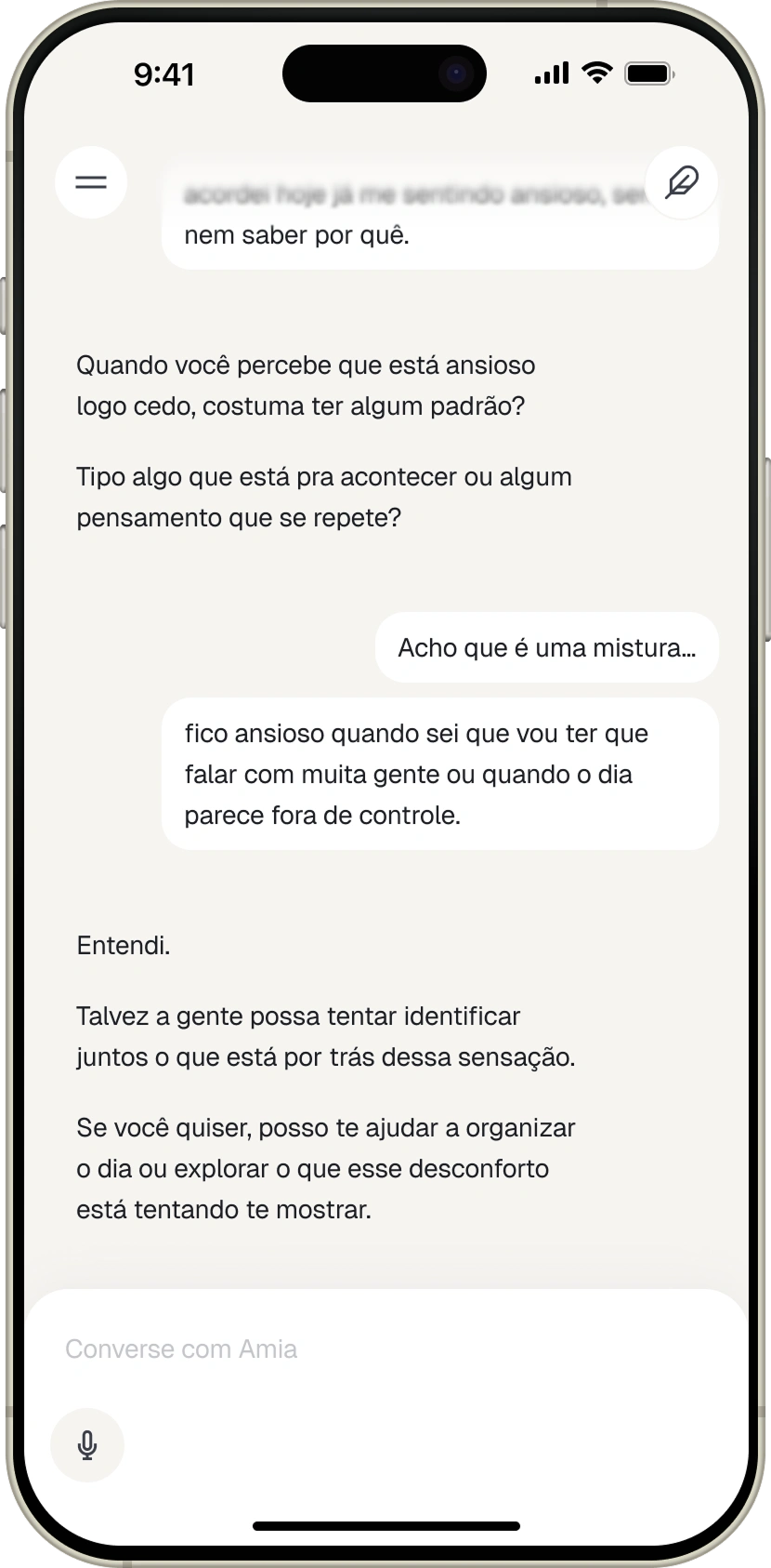 As conversas com a Amia são protegidas por um PIN pessoal, e todo o texto é criptografado, garantindo que só você tenha acesso ao seu espaço de reflexão.
